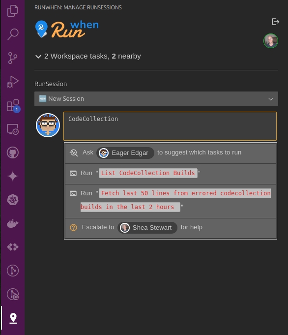 Authors can also interact with the CodeCollection Authors workspace through the RunWhen VS Code Plugin. The workspace will show up in the selector as CodeCollection Authors or runwhen-authors.