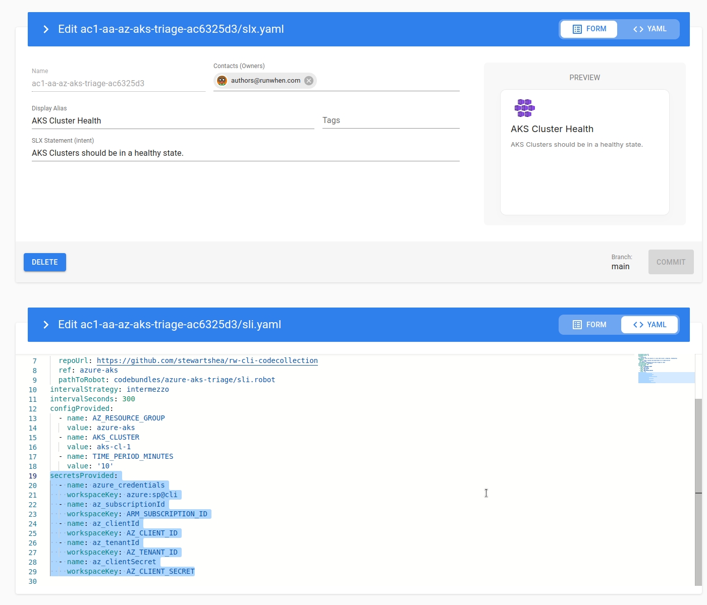 The above screenshot outlines the secretsProvided configuration to point at a RunWhen Managed secret, which can be added/updated through Configuration -> Secrets