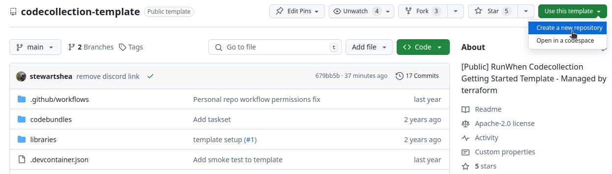 To get started, first create a CodeCollection using the repository template on GitHub. Select the Create a new repository option from the Use this template dropdown.