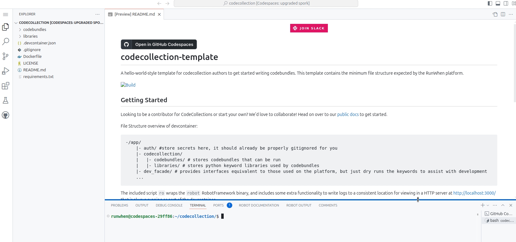 With your template created you'll be able to run it in codespaces (or locally using the devcontainer VSCode plugin).