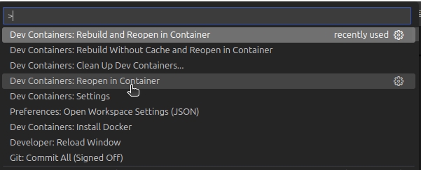 If running in Visual Studio Code, clone the repository and upon opening the repo, access the Command Pallet (Ctrl + Shift + P) and select "Dev Containers: Reopen in Container"