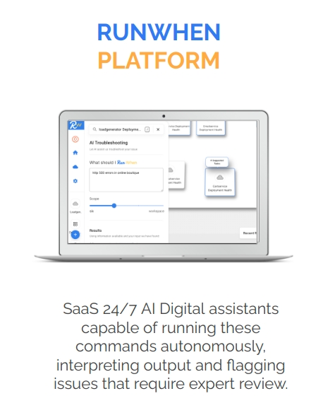 RunWhen's Engineering Assistants suggest and run automated troubleshooting tasks written by (paid) experts for root cause analysis and remediation. Engineering Assistants replace the need for runbooks, and can autonomously respond to existing alerts, tickets and help requests from your dev teams.