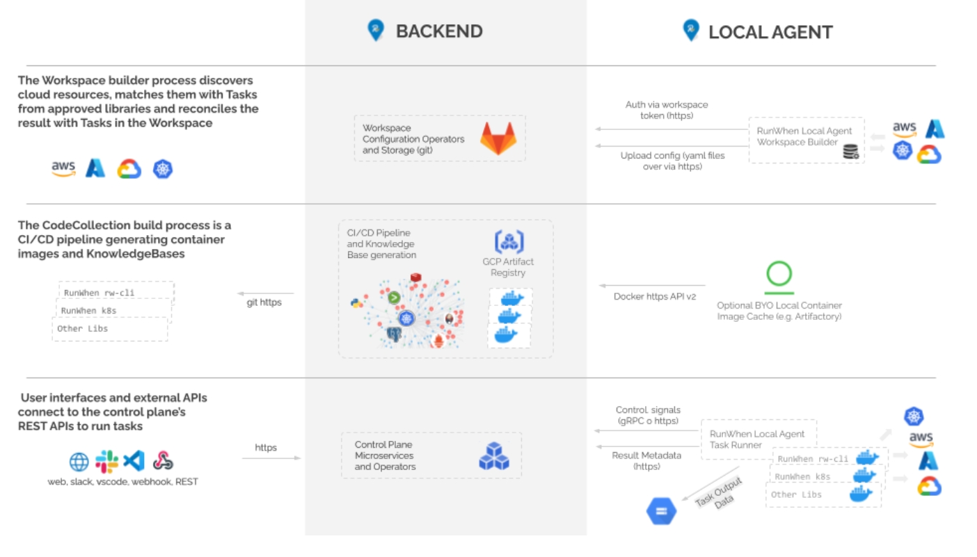 When new Tasks are added to either public or private libraries (source code), the source code is analyzed and built into container images using the RunWhen CI/CD pipeline. For public libraries (open source), the pipeline also uses LLMs to generate thousands of embeddings where the Task is relevant, adding them to the RunWhen knowledge base. The result is both container images stored in the GCP Artifact Registry and the public and private Knowledge Bases that power the RunWhen backend system.