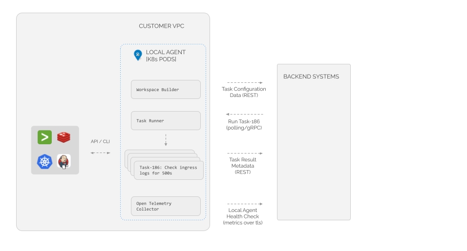 The Local Agent responsible for running Tasks is installed as a set of pods running in one the customers' Kubernetes clusters. Most users have one Local Agent instance for dev and one for prod, or one per security zone. Details on this are below.