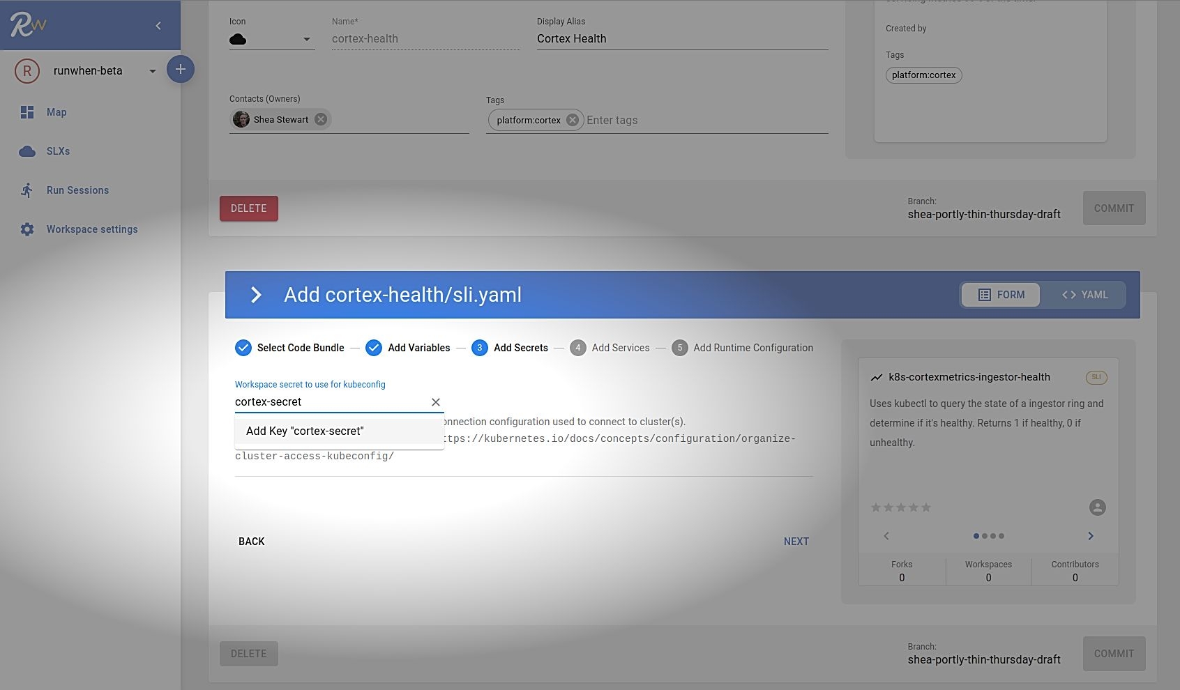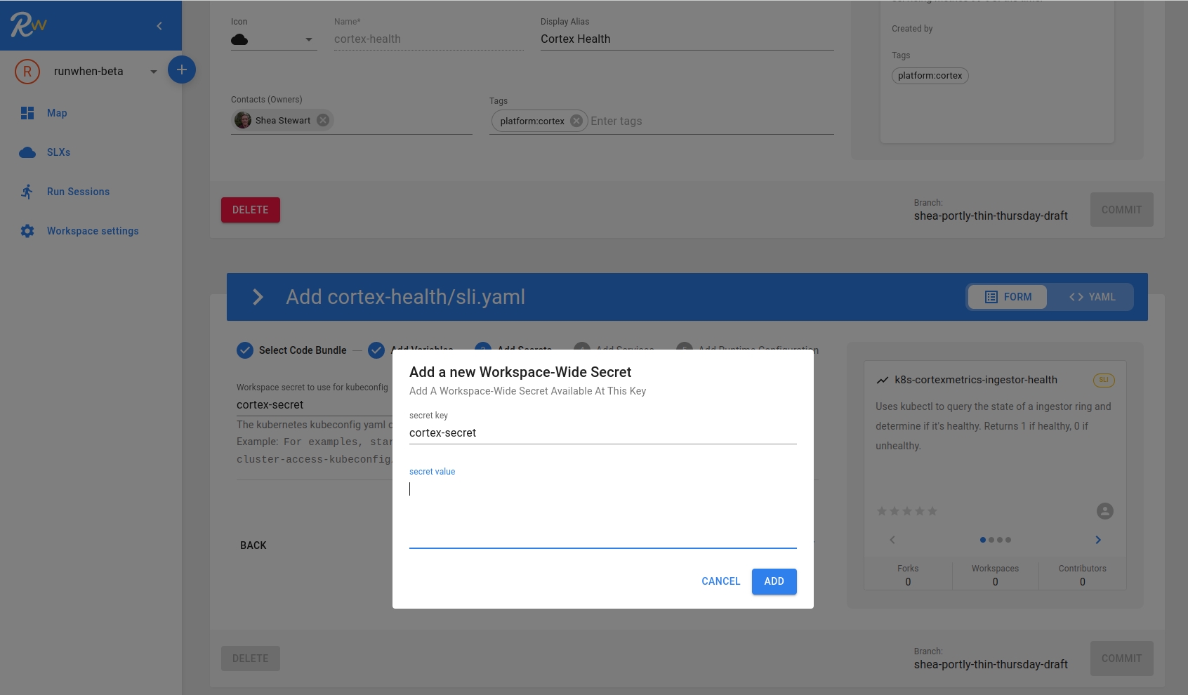 Secrets can also be added from the SLI or TaskSet configuration window as well. When a codebundle requires a secret, simply start typing the name of a new secret and click "Add". The RunWhen UI will prompt you for the secret values.