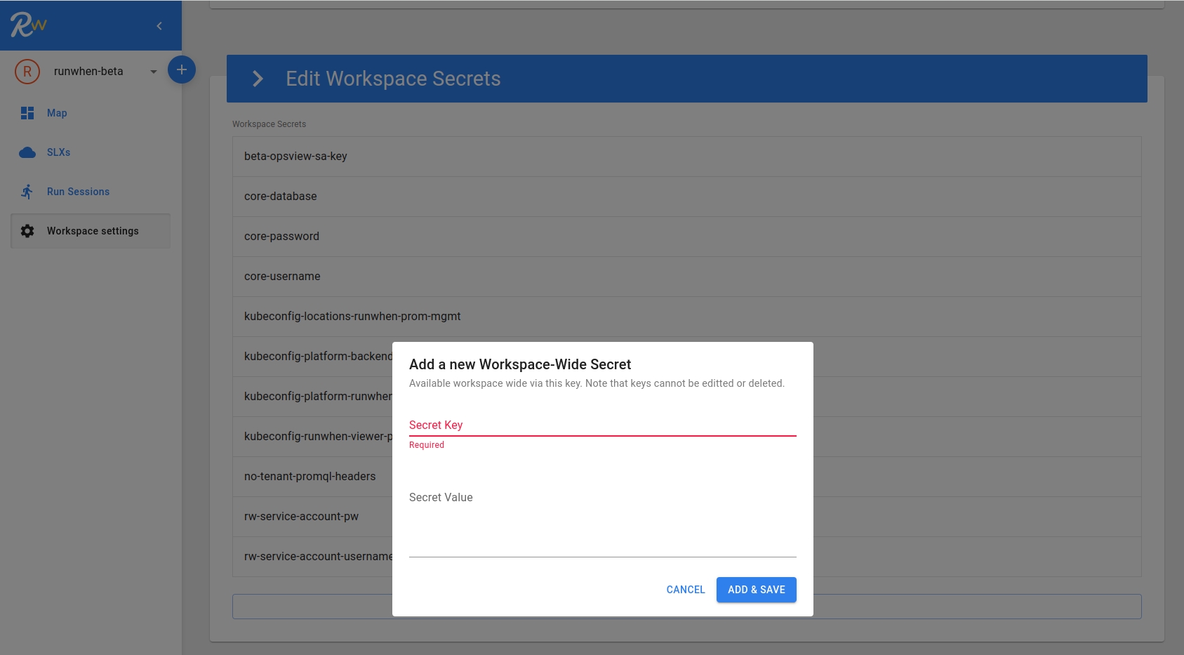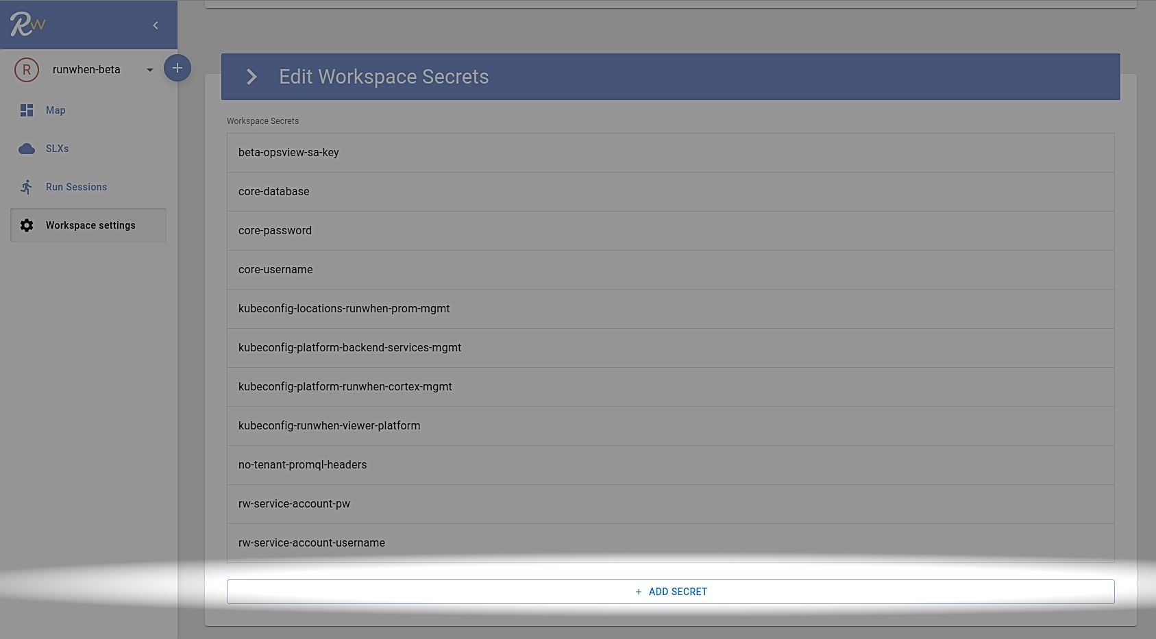 Secrets are managed at the workspace configuration level and are available to be used by SLI or TaskSet codebundles that require secrets. Secrets can be written and overwritten from the RunWhen UI, however, they cannot be read.