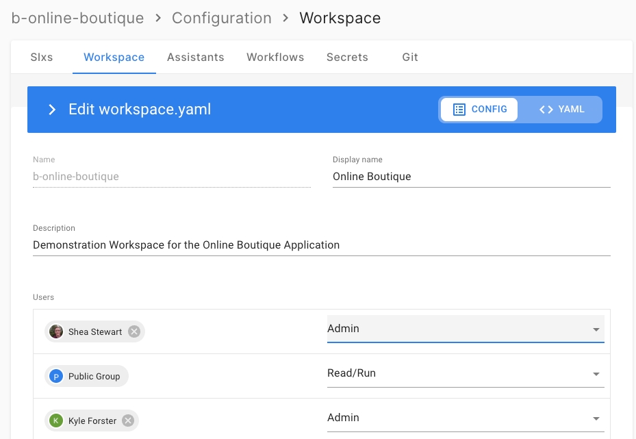 If the team at RunWhen has reason to suspect that an incident has occurred involving a potential breach of Workspace data, the team will make all commercially reasonable efforts to contact all users that have "admin" role via email. A Workspace may have unlimited users with an "admin" role. This is configured in the corresponding workspace.yaml file and in the UI shown below.