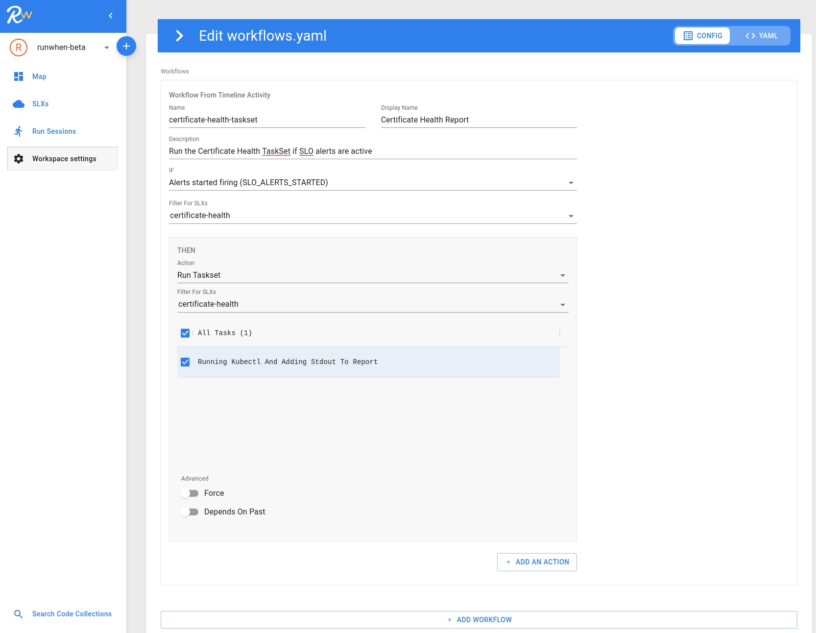 Workflows, configured at the workspace level, enable users to automatically trigger TaskSets or notifications based on activities (such as runsessions being started, or SLO alerts firing).